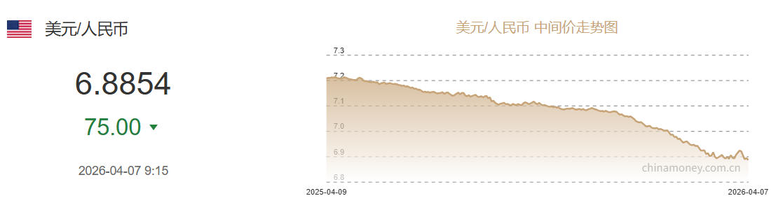 4月7日人民币对美元中间价报6.8854 上调75个基点
